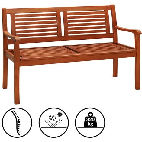 Installez-vous confortablement et profitez des belles journées d’été sur votre terrasse ou dans votre jardin. Le banc 2 places résistant aux intempéries est fait de bois d’eucalyptus et pré-huilé. Grâce à son dossier en forme ergonomique et ses accoudoirs incurvés il est très confortable.