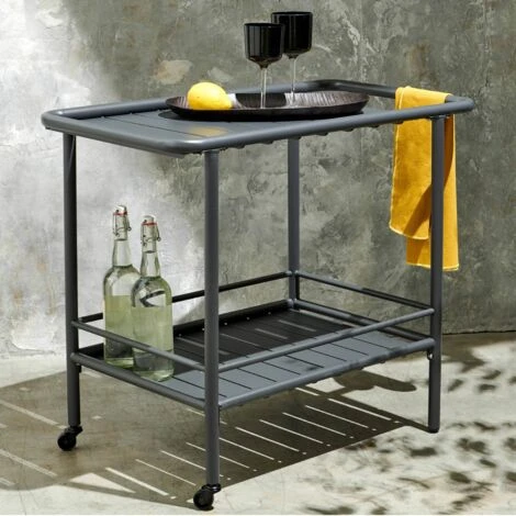 Profitez au maximum de vos repas en plein air avec la desserte de jardin à roulettes. Signée PALAVAS, elle présente un design indus et pratique, 100% acier thermolaqué. Avec ses 2 plateaux, elle permet de garder à portée de main rafraîchissements, salades et desserts sans encombrer votre table, et sa poignée large permet de la manipuler facilement ou d’y suspendre torchons et serviettes. Équipée de 2 roues à l’avant, elle se déplace sans efforts. La desserte de jardin en acier est traitée anti-corrosion à la peinture époxy et ne craint donc pas l’humidité. Facile à entretenir, il suffira d’un lavage rapide avec une éponge pour la maintenir en parfait état.