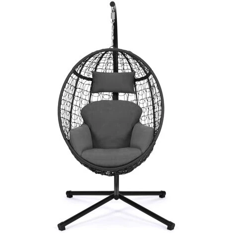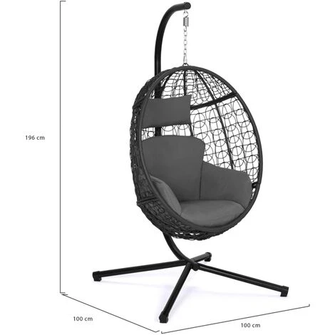 Accordez-vous un moment de détente dans ce fauteuil œuf suspendu au design sobre et élégant et profitez de son mouvement de balancier pour vous reposer en toute tranquillité !Le fauteuil, avec son design tendance rond en résine tressée s’accordera aussi bien à votre décoration intérieure qu’extérieure. Fourni avec un socle, vous n’aurez pas besoin d’accrocher votre fauteuil au plafond. Son large pied en acier noir ainsi que la chaine et le ressort qui l’accompagnent sont autant d’éléments qui vous assurent une bonne stabilité. Profitez ainsi du mouvement de balancier en toute sécurité.Ce socle vous permet également de déplacer votre fauteuil suspendu où bon vous semble en fonction des saisons et en profiter ainsi dans votre salon en hiver ou au bord de votre piscine en été. De plus, avec son coussin gris de 15 cm d’épaisseur, ce siège ultra confortable deviendra rapidement un élément indispensable pour vos moments de détente. Robuste, ce fauteuil œuf peut supporter un poids jusqu’à 100 kg. Dimensions du fauteuil œuf suspendu gris Dimensions totales hors tout : Longueur 100 cm x largeur 100 cm x Hauteur 196 cmDimensions du fauteuil : L.93 x l.60 x H.110 cmDimensions du pied : L.100 x l.100 x H.196 cmStructure en acier noirFauteuil en polyrotinCoussin en polyester gris déhoussable, grammage 200DDiamètre des tubes : 4,2 / 4,8 cmÉpaisseur des coussins : 15 cmCharge maximale : 150 kgÀ monter soi-mêmeCe fauteuil suspendu existe en effet rotin et coussin écru mais aussi en effet rotin et coussin gris.Retrouvez également tous nos fauteuils de jardin disponibles sur notre boutique en ligne !