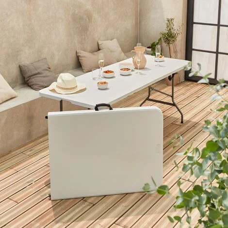 Lot de 2 tables de réception en plastique blanc de 180cm parfaites pour vos événements familiaux en intérieur ou en extérieur. Pratiques, elles sont légères et se manipulent simplement. Les poignées permettent un transport facile, vous pourrez les installer là vous le souhaitez dans votre jardin ou sur votre terrasse. Pliables, il suffira de les déplier et de les poser avant l’arrivée de vos invités. Pliées, elles ne mesurent que 90cm de long, cela permet un gain de place optimal. Les tables sont conçues en plastique injecté robuste, la structure est en acier gris. Pratique, le plastique se nettoie très facilement.