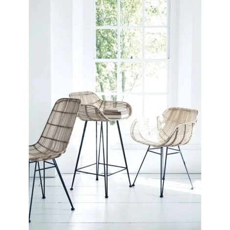 Chaise haute de bar en rotin, un matériau naturel, solide, léger, résistant et imputrescible. Piétement stable en métal noir.