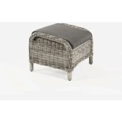 Repose-pieds d’extérieur gris en aluminium et rotin synthétique rond, avec coussin de couleur anthracite.