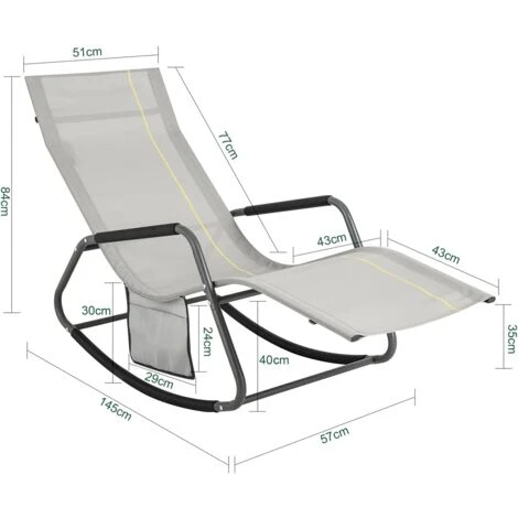 SoBuy OGS47-HG Fauteuil à Bascule Transat de Relaxation Chaise Longue Bain de Soleil Rocking Chair – avec Pochette latérale et Repose-Pieds Ideal pour salon, jardin, camping, balcon, plage, salon, chambre, etc. Vous pouvez vous asseoir et vous coucher dans une position idéale et agréable. Cette chaise longue vous offrira de merveilleux moments de détente à l’extérieur ou/et à l’Intérieur. – Assise confortable. – Avec repose-pieds et la pochette sur le côté. – Structure en tube de méta, très robuste et solide. – Résiste aux intempéries. Caractéristiques: – Matériel : métal enduit noir antirouille et textilène. – Dimensions (L x l x h): 145 x 57 x H84 cm. – Poids de l’envoi : 7.8kg. – Capacité de charge: jusqu’à 150 kg. – N.B. : Cet article ne se plie pas. – À monter soi-même facilement. Avec la notice de montage illustrée et les pièces numérotées, le montage est facile. Contenu de la livraison : 1x Fauteuil neuve emballage d’origine, notice de montage. Ce article est livré sans éléments décoratifs des photos. Facture fournie.